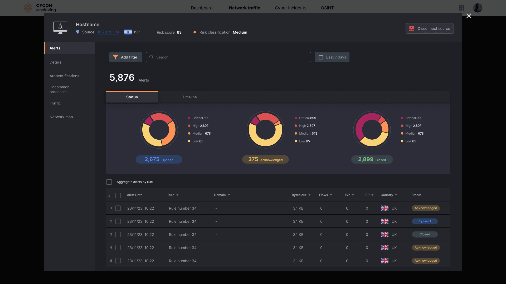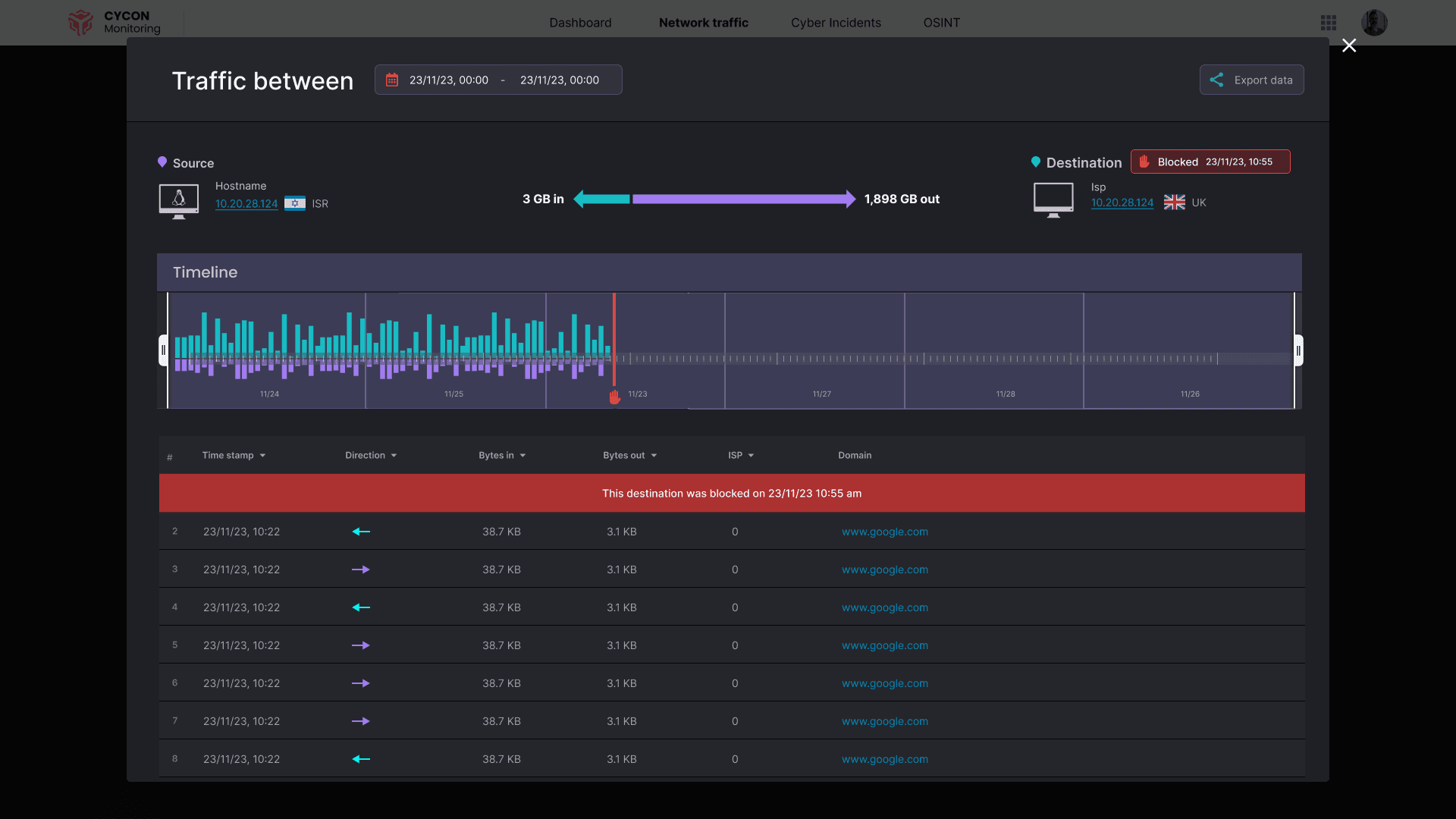 Traffic AnalysisVisualizing multi-directional traffic between your organization and external sources, highlighting patterns, anomalies and potential threats in real time.