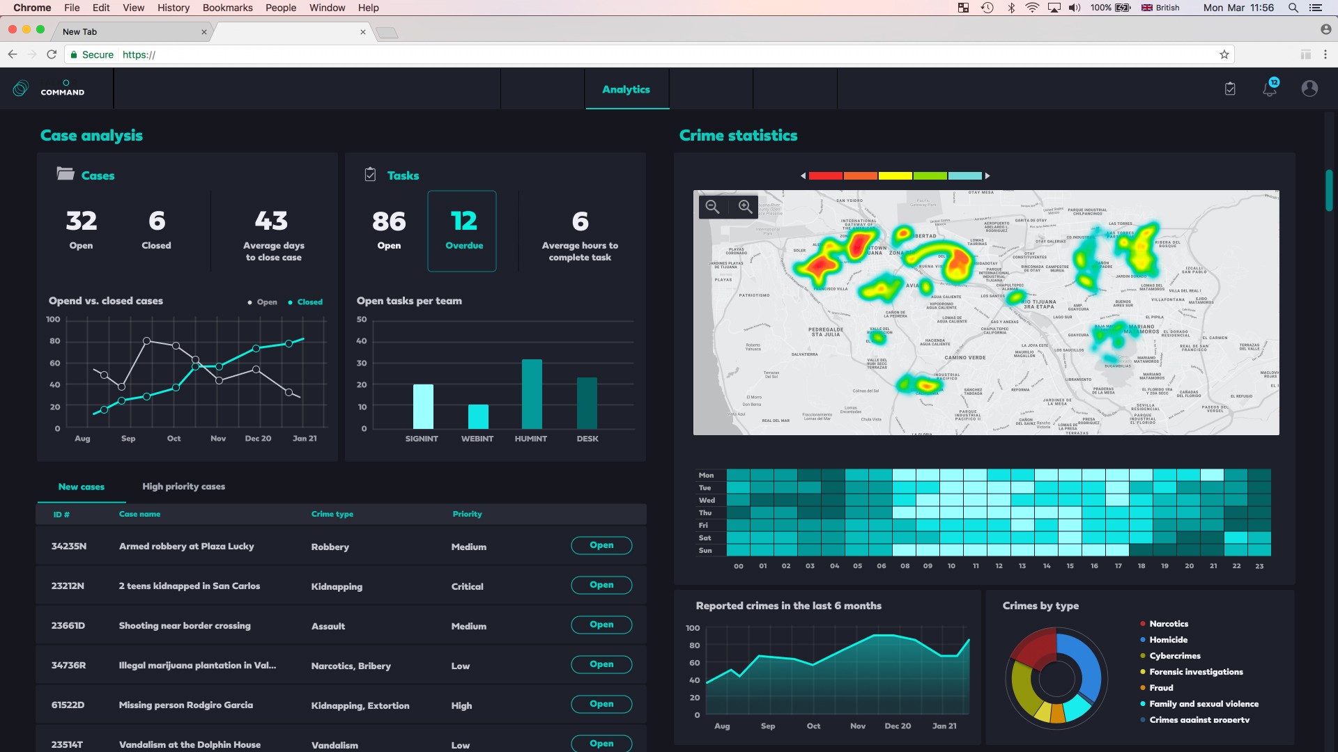 A centralized dashboard displaying real-time crime cases, active police units and tracked entities, built for operational oversight and rapid decision-making.